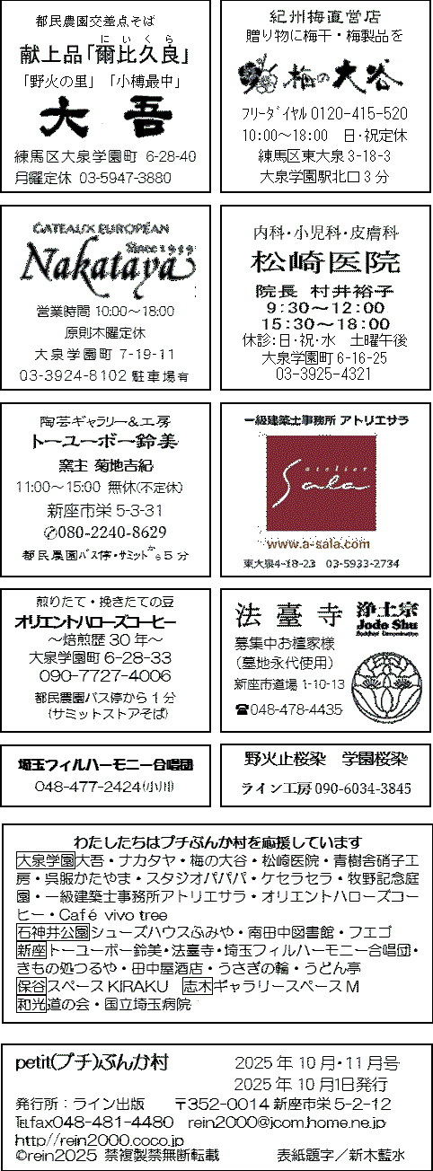 ●木と貝でつむぐ杉山雅子のファンタジー ●高齢者もこどももみんなごちゃまぜ? ●成増童謡まつり ●第19回 森の音楽会 ●第10回 野火止用水灯明まつり ●キーウ・クラシック・バレエ「白鳥の湖」 ●福田博子遊筆展 ●歌声喫茶ともしびin大泉学園 ●映画『盤上の向日葵』 ●装いの翼 いわさきちひろ、茨木のり子、岡上淑子10/31(金)〜2/1(日) 10:00〜17:00 1200円 月曜休館 ちひろ美術館・東京 練馬区下石神井4-7-2(上井 ●松永安左ヱ門生誕150周年記念展 ●新座ウインドオーケストラモッソ第10回定期演奏会 ●立川志らく独演会 〜ひとり談志祭り〜 ●「遺伝性がん当事者からの手紙」写真パネル展11/21(金)〜12/12(金) 国立埼玉病院1階会計窓口前和光市諏訪2-1 048-462-1101 ●「ウィンナー・クラシック」 モーツアルトの響き11/24(月祝)13:30 3500円 新座市民会館 新座市野火止1-1-2(バス停新座市役所前4分) 048-481- ●大相撲新座場所
